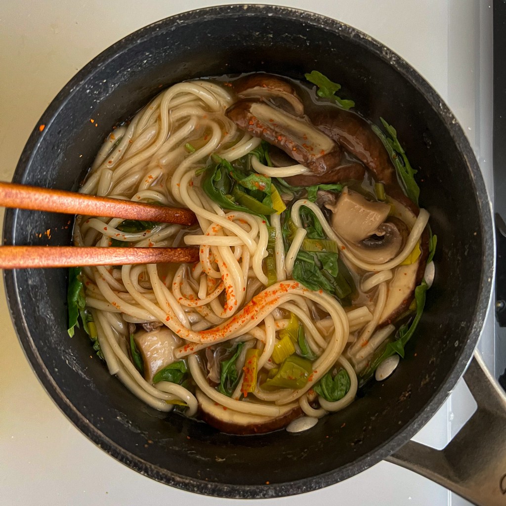 The last thing I want to highlight as a complete success was an udon soup with homemade chicken stock. It turns out that a small saucepan works excellent for making a small batch of chicken stock made from the bones of a thigh and a leg; just add a few aromatics, and you have something special. Then I added some mushrooms, cooked dried udon in the broth, and seasoned the entire thing with fish sauce and some lime juice. I know that fish sauce is not Japanese! I was trying to go through what I had in my pantry, ok? I also put arugula to have something fresh and voilá, delicious Frankenstein Asian soup.