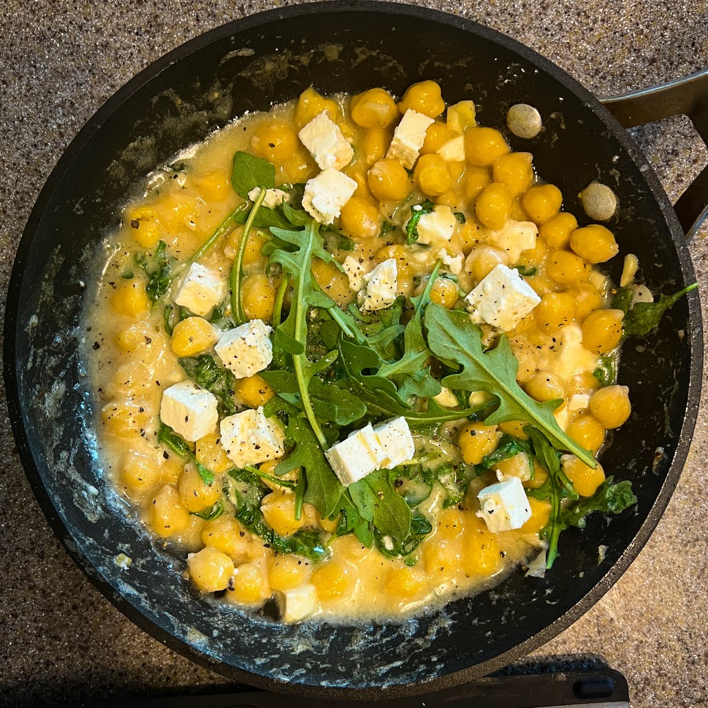 Another thing I had in abundance was arugula. I got it to make dressings and eat it as a salad. However, I used it in other creative ways, like greens for an udon soup and herbs for my “chickpea cacio e peppe,” inspired by Ottolenghi’s cookbook ‘Shelf Love.’ I was pleasantly surprised by how versatile this ingredient was.