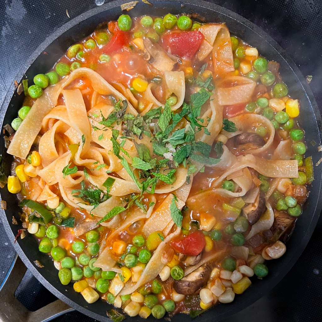 Minimalistic cookware was not the only challenge I took on; also, how to use every leftover ingredient I had. For example, I had about three portions of tagliatelle, some frozen peas, frozen corn, and other goodies, including a large can of peeled tomatoes. Since tagliatelle goes well with chunky sauces, I decided to do a “whatever there is” sauce, which turned out to be fantastic.