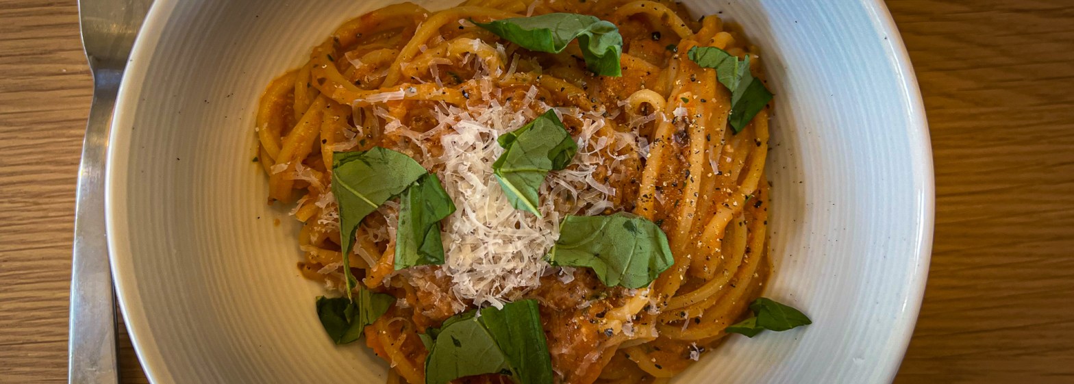 Spaghetti with Eggplant and Tomato sauce. This one is quite simple; I cooked a few Indian eggplants in the sauce and then blended everything with some pasta water using my hand blender, finishing the dish with torn basil leaves.