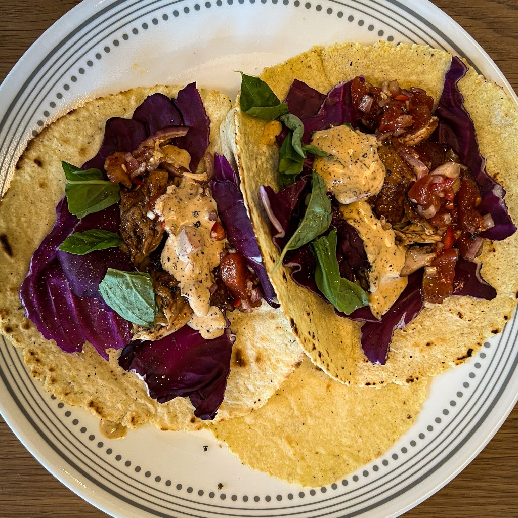 Chicken tacos with purple cabbage, tomato salsa, and chipotle mayo.