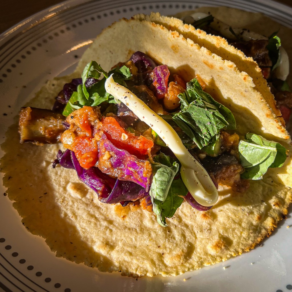 Mediterranean Tacos. I had some leftover stewed chickpeas; thus, I made some more corn tortillas and had these fantastic tacos. I added some asparagus and purple cabbage for crunch and freshness.