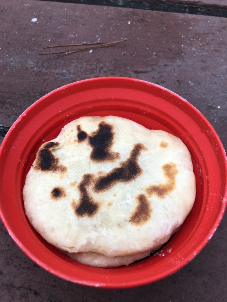 Fact is, there are several bread kinds that are cooked on a stovetop. Naan, English muffins, or pita bread are some. However, English muffins require egg whites, which is challenging to keep fresh while camping; and pita bread requires a solid stream of heat to make its typical air bubble, (achieved at home by cooking it on a cast-iron skillet). So inspired by these two, I came up with a method to prepare something that would be a hybrid between English muffins and pita. That can be prepared between the time you pitch your tent and when you wake up for breakfast.