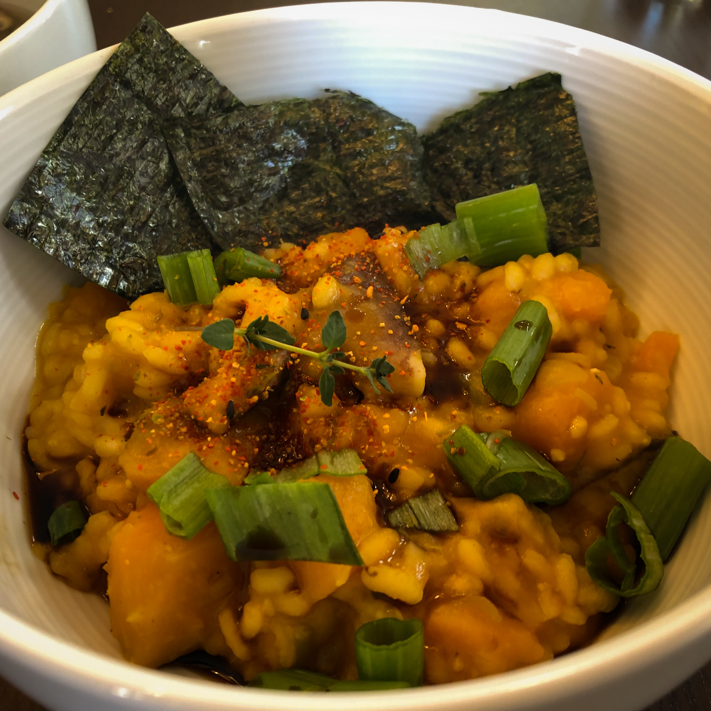 - Plate the risotto adding nori, scallions, and Shichimi togarashi.