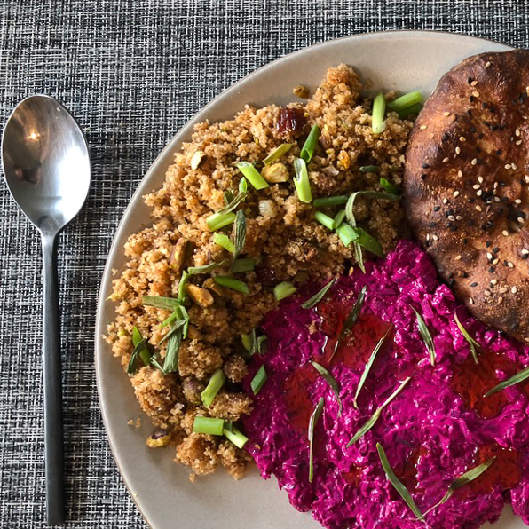 Persian beet and yogurt dip with barbari bread, and a pilaf with dates and pistachios.